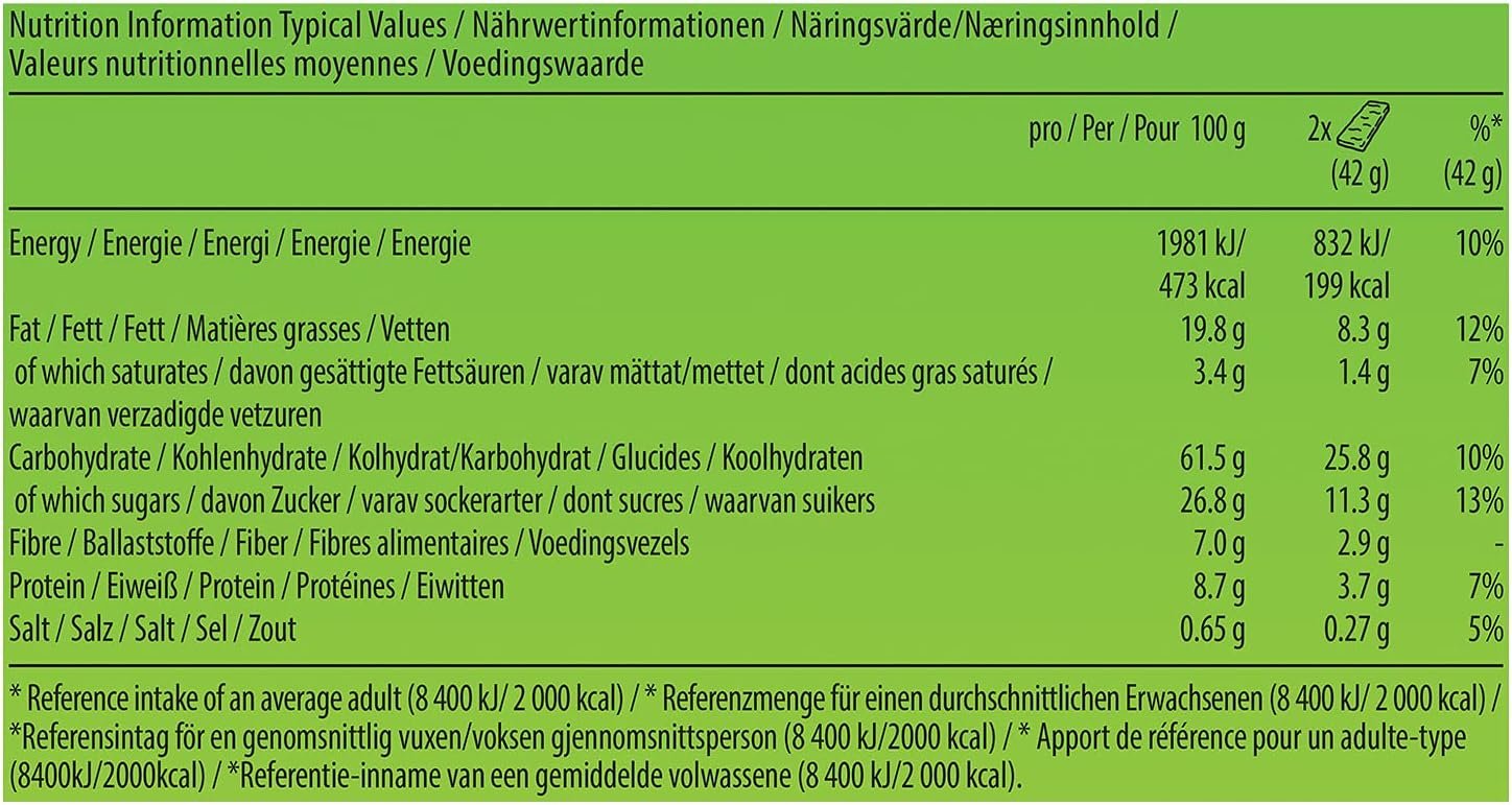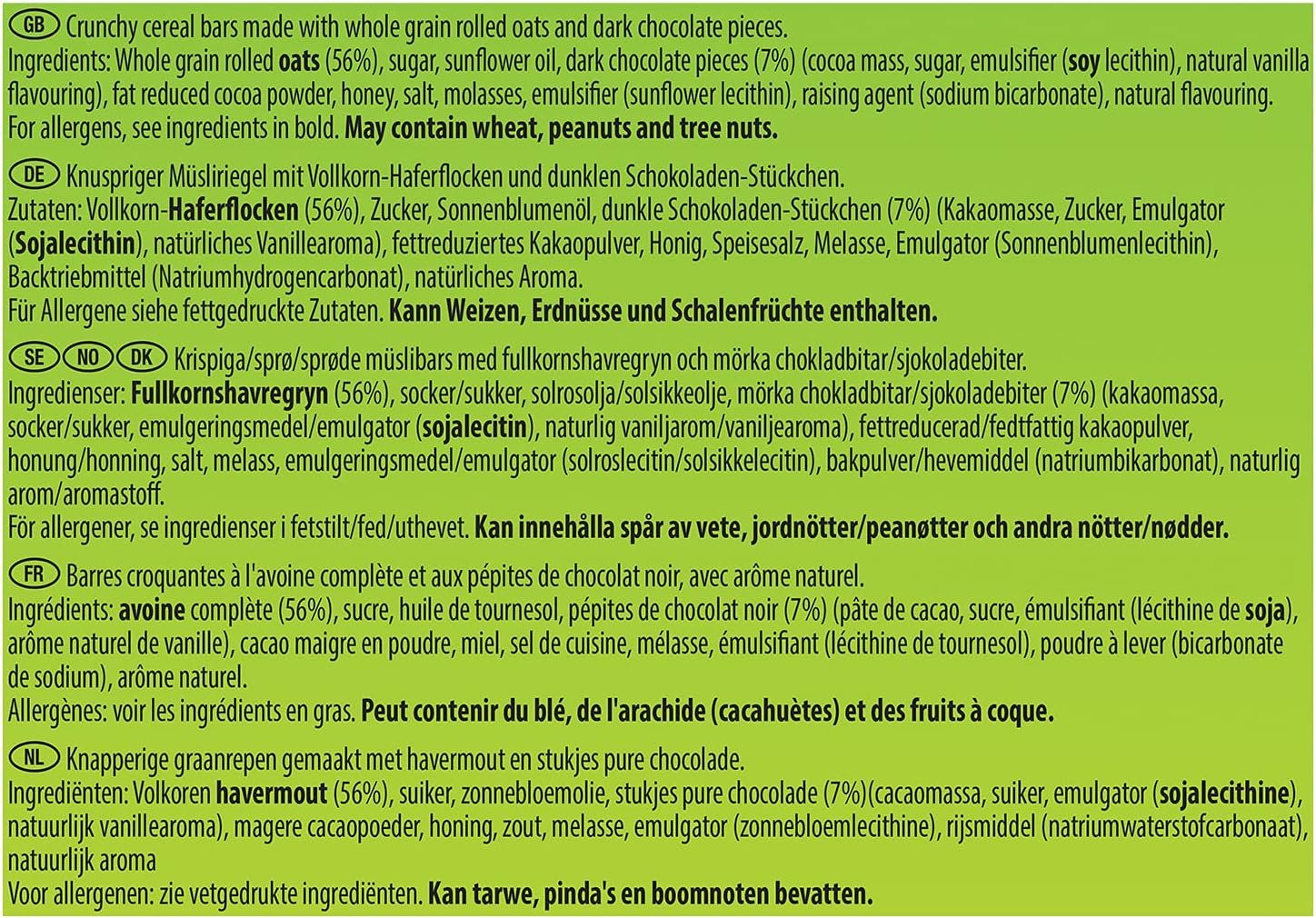 Whole grain rolled OATS (56%), sugar, vegetable oils (sunflower, rapeseed in varying proportions), dark chocolate pieces (7%) (cocoa mass, sugar, emulsifier (lecithins (SOY)), natural vanilla flavouring), fat reduced cocoa powder, honey, salt, molasses, emulsifier (lecithins), raising agent (sodium bicarbonate), natural flavouring. Forallergens, see ingredients in bold. MAY CONTAIN WHEAT, PEANUTS AND TREE NUTS.