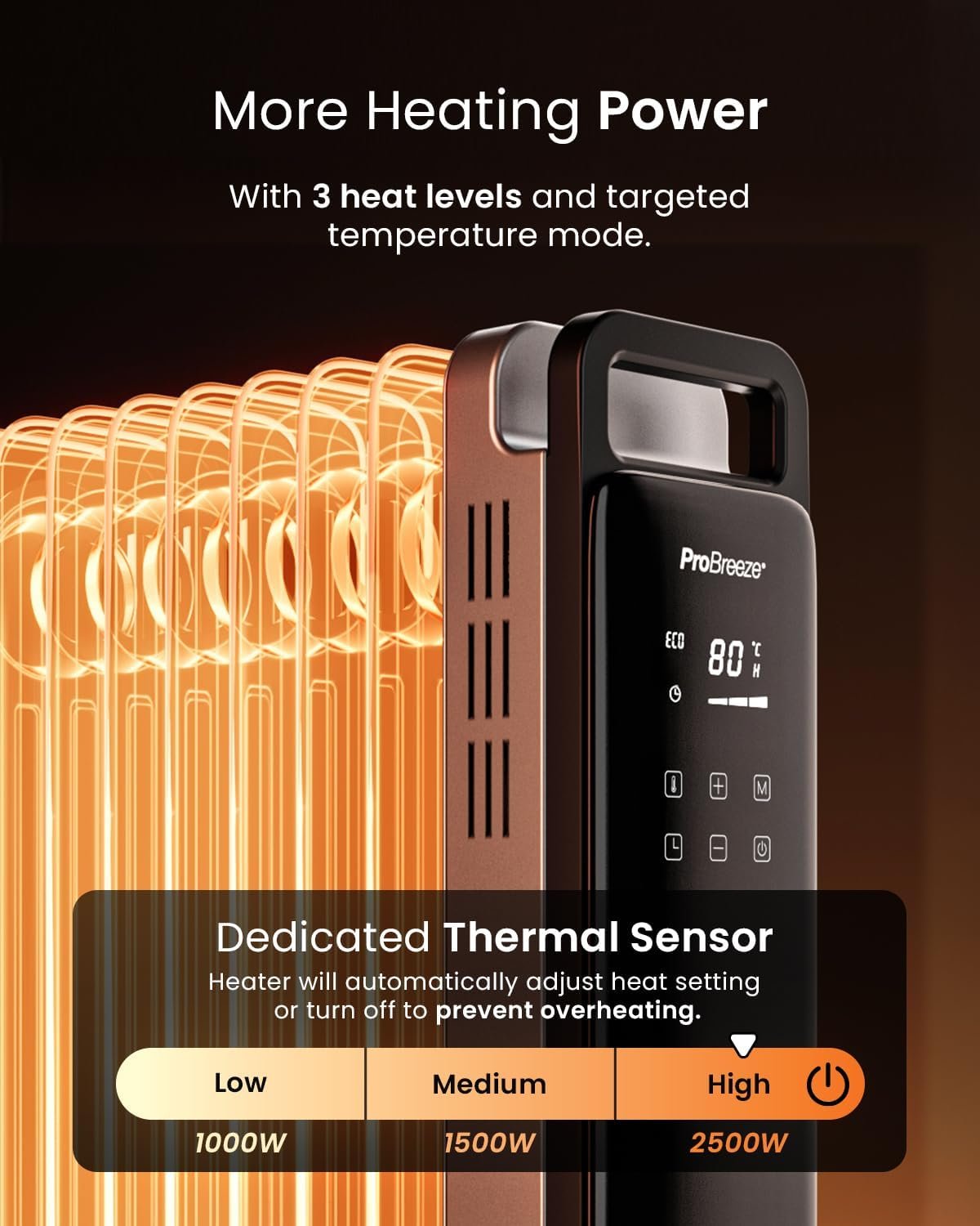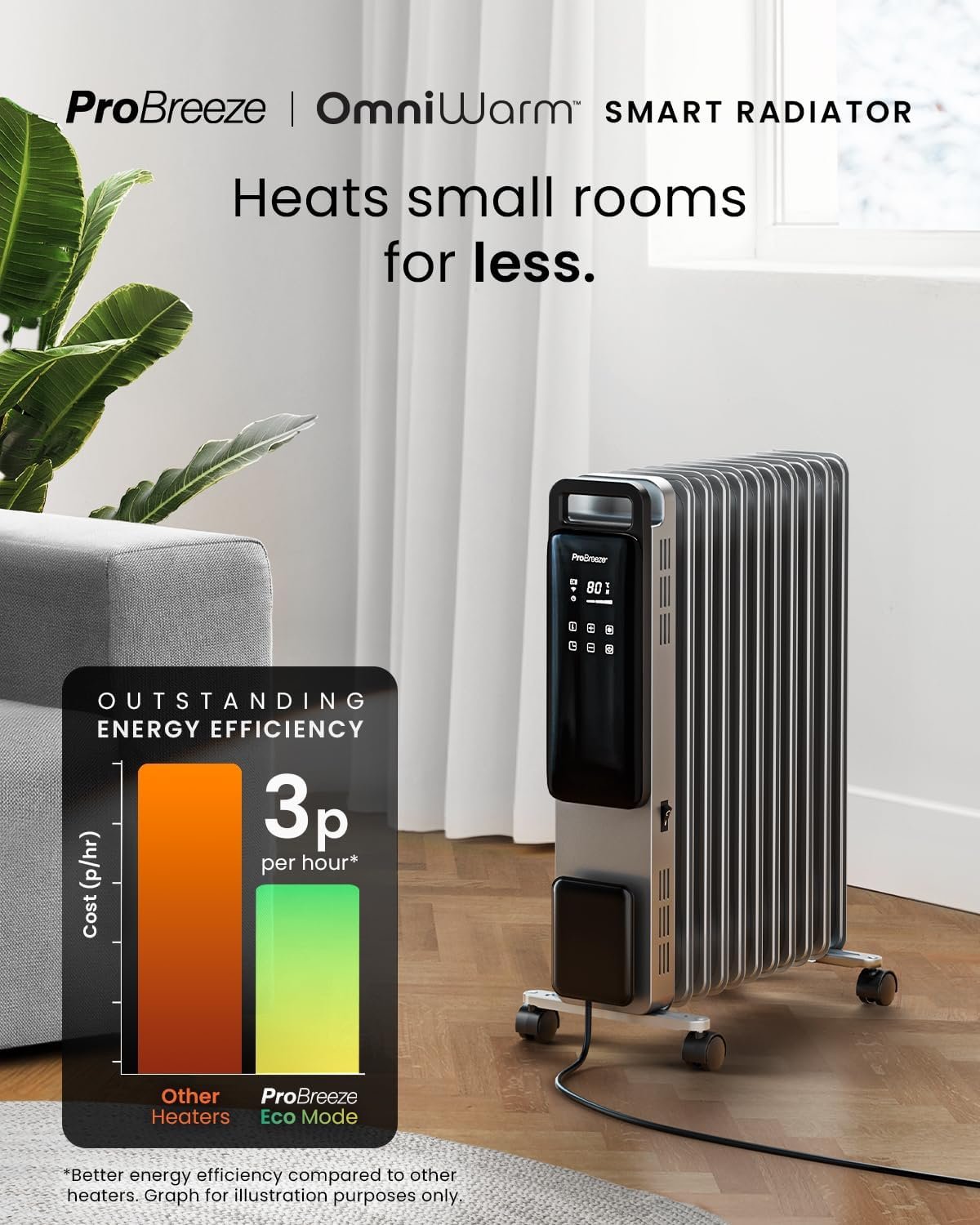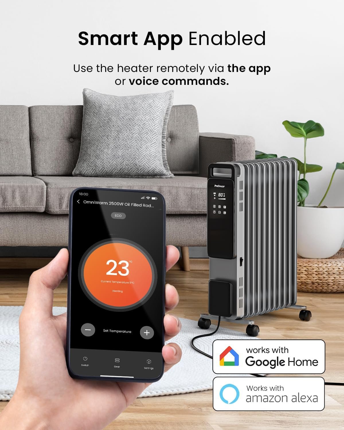 Pro Breeze Smart 2500W 11 Fin Oil Filled Radiator with Digital Display and WiFi Smart App, Thermostat, 24Hr Timer, 3 Heat Modes, Child Lock, Overheat & Tip-Over Protection Oil heater for Home – Silver